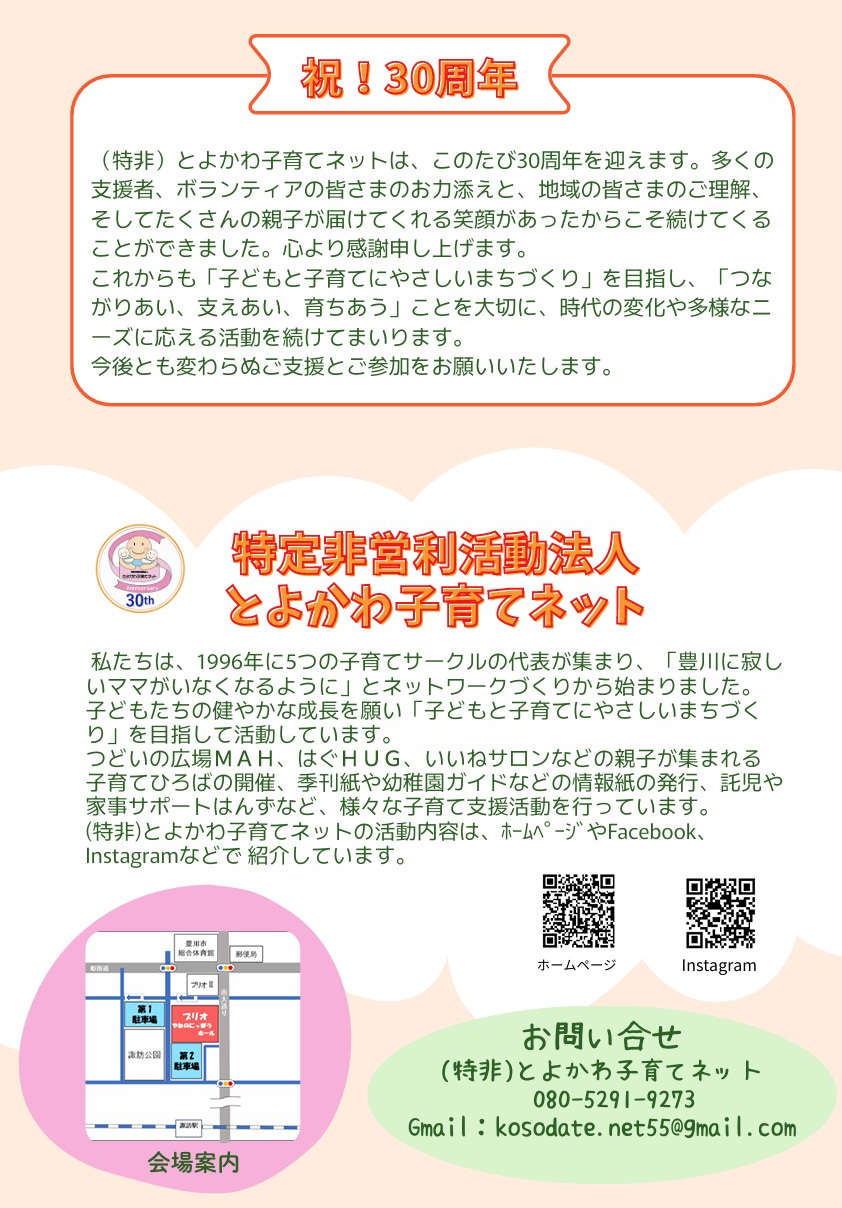 (特非)とよかわ子育てネットは、令和8年1月に設立30周年を迎えます。