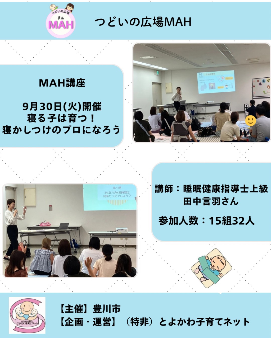 睡眠健康指導士上級、田中言羽先生をお招きしてMAH講座「寝る子は育つ!寝かしつけのプロになろう」を開催しました。